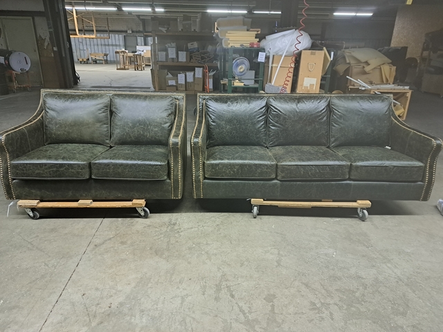 New, never been used. Top grain leather sofa and loveseat. Kiln-dried hardwood frame. Does have 2 minor dents in the sofa outside back from shipping as seen in pictures.