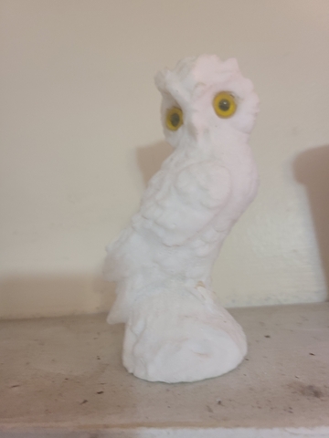 Small white owl porcelain about four inches tall sets on a shelf 2.00