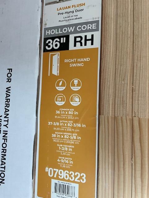 Interior, pre-hung door. 36" RH swing. Hollow core.