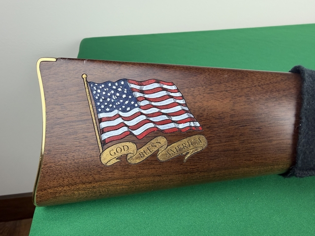 Beautifully engraved with our American flag on the stock. The statue of Liberty on one side of the receiver with The a American Eagle on the other.