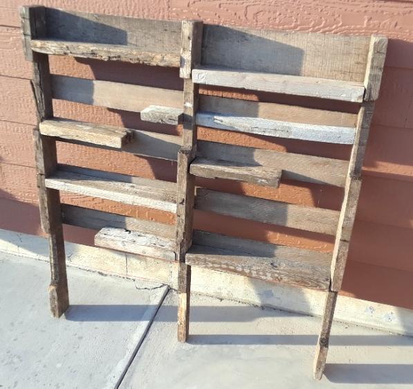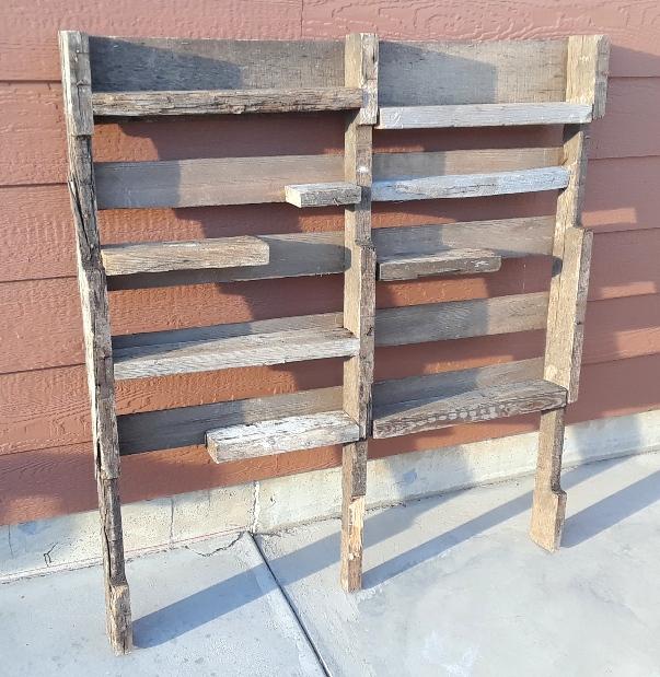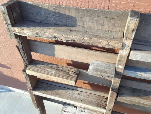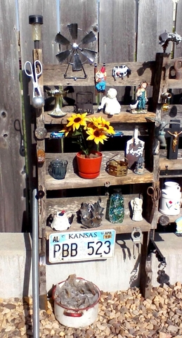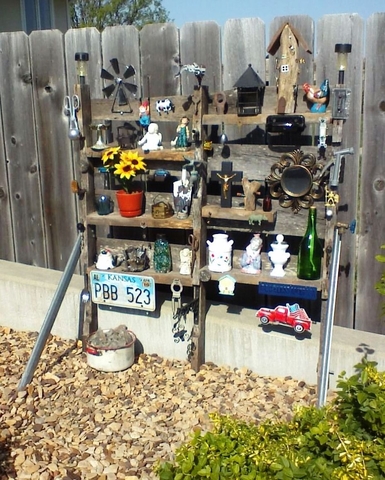 Garden Knickknack Shelf $20.00 Selling one Yard Art Décor Garden Knickknack Display with 9 shelves. This is designed to mount in your backyard, patio or garden to display various outdoor knick knack items including old bottles, rusted antique pieces, collectible trinkets, curio items, ceramic or glass décor and seasonal pieces. Dimensions” 40” wide, 48” tall, 5” deep with 9 shelves that are 17½ ” wide to place your knick knack items on. The attached sample photo shows an example of various items screwed and glued on the shelves. Unique yard décor to add something different to your back yard. (the various knickknack item shown in the sample photo are NOT included with the sale of the basic Yard Art Knickknack Shelf) You add what ever items you want - to decorate your shelves and hang items on the vertical wood supports. That’s the FUN part – decorating it how ever you want.