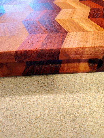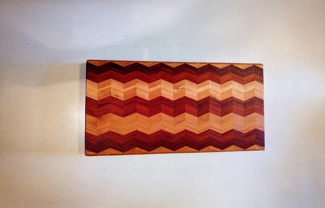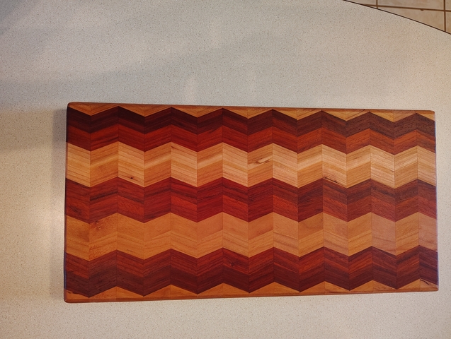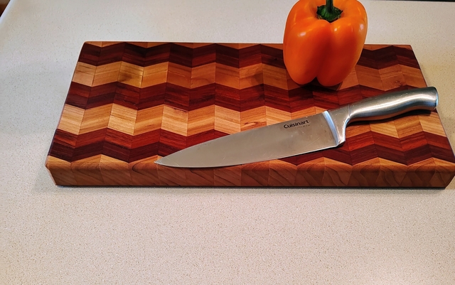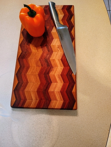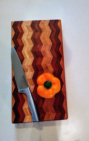 Elevate your kitchen aesthetic with this stunning, handcrafted chevron-pattern cutting board. Combining the warm, honey tones of American Cherry with the vibrant, fiery crimson of African Padauk, this board is as much a piece of functional art as it is a culinary workhorse.