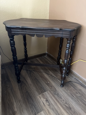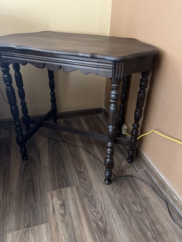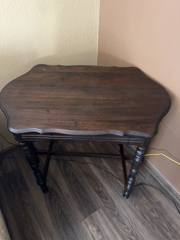 Beautiful antique side table. Beautiful ornate edges and 6 legs. Bottom middle brace was broke, but has been mended to see pictures. 29 " tall, 21 ", deep 34 " long.. $50 or best offer.