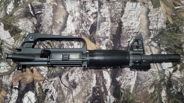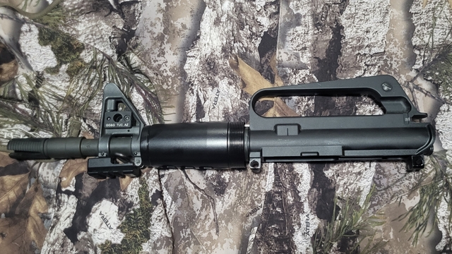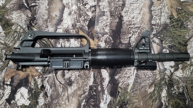 Retro DOE/Kitty Kat style 5.56 AR upper with vortex flash hider, QD mounts, and picatinny rail.