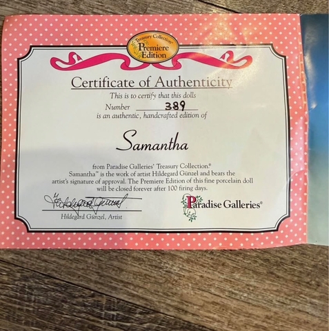 Brand new in box. Paradise galleries Samantha porcelain doll. Has certificate inside box. Number 389 premiere edition. Asking $20.00