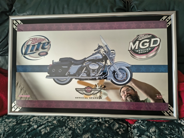 Vintage used 2003 Miller/Harley Davidson advertising mirror. Approximately 19.5 x 31.5 inches. This sell on eBay for approximately $175 to $140. I am only asking $100. I have to be honest as this is not new and has been cleaned over the years. So there might be light rub marks on it. There is also water marks on its back side. Does not affect the overall nuisance and nostalgic appearance.