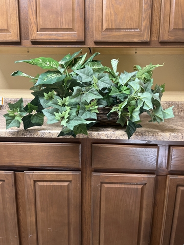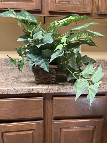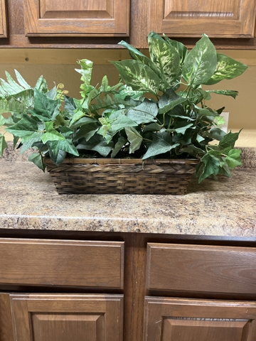 Nice little artificial plant in basket. In good shape great little accent for any table or stand. Basket is 16 " long, 5"Wide. Make offer.