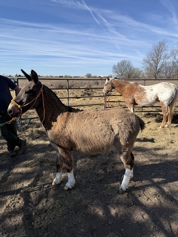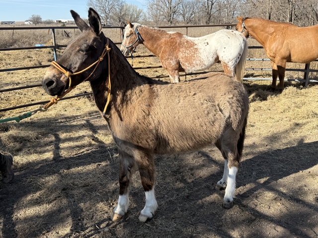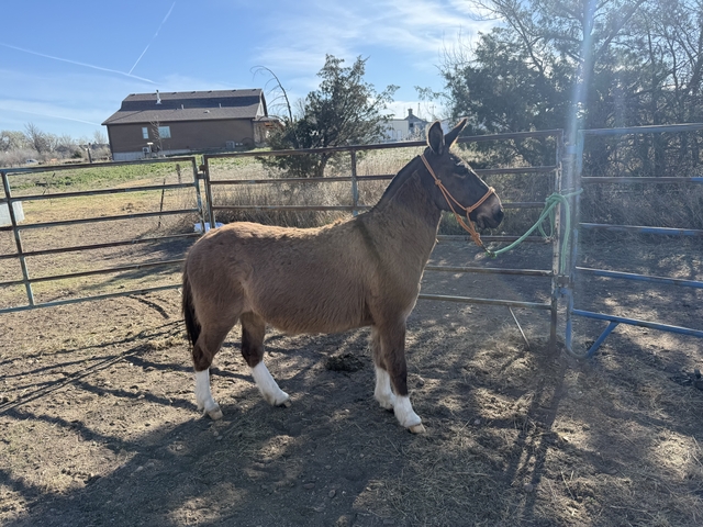 He’s a smaller mule that will need some time and consistent work. Not finished and not currently being used, so he’ll need someone willing to put some time into him.