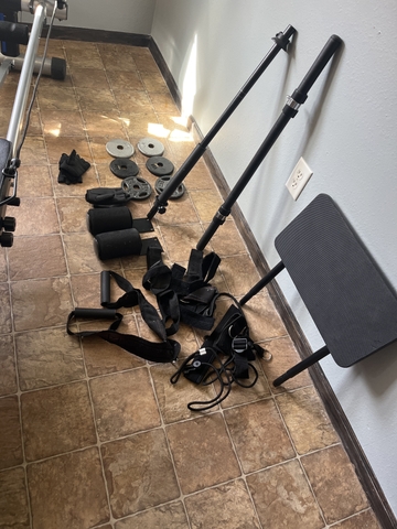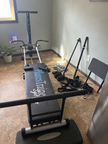 This is a very versatile Pilates system can be used for regular weights, pull-ups, presses and Pilates This machine usesresistance bands to adjust levels and can add small weights. I'm also including small step that I used to raise the machine up on some exercises machine has wheels so it rolls easily and it folds for compact storage. $150.00or best offer