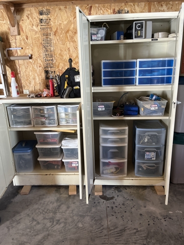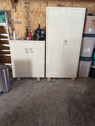 Two garage storage cabinets wonderful for holding tools and other accessories to be stored. They do lock. 1 is 19 1/2 " deep, is 42 "tall by 36" long. The other one is 36"wide by 6 foot tall 19"deep.$200.00. for the pair.