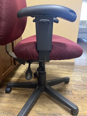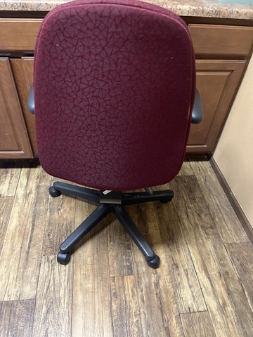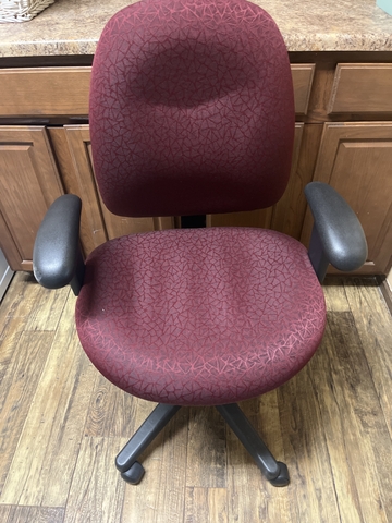 This office chair is in a great red fish burgundy color from the inside of the armrest. The measurement is 20 1/2 " By 18 1/2 " That's wider than the average chair getting more room to move about. The back rest And armrest are adjustable armrests are removable. See Pictures..