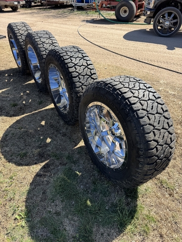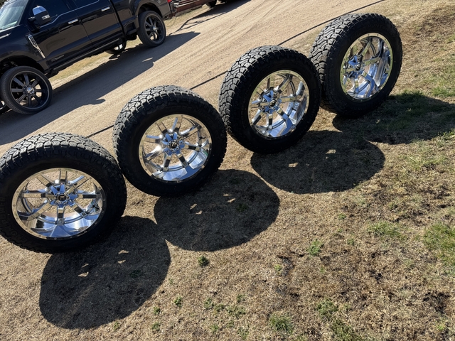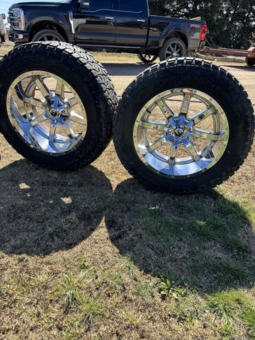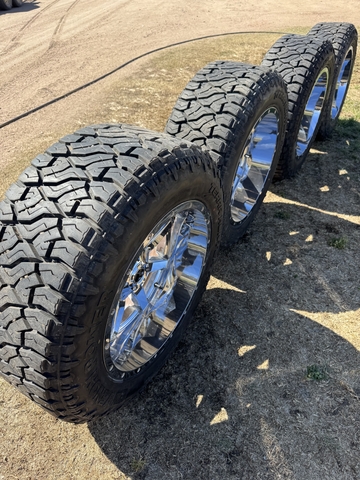I have a set of 37x13.50R22 Fuel chrome wheels and Terra Hunter tires. 12 ply tires have at least 80% tread left on them, and no chopping. Chrome wheels are in good shape. A couple imperfections if you look close, but otherwise look great. Fits '02 to current Ford Super Duty 8 bolt. Lug nuts included. Message me with any questions. Thank you.