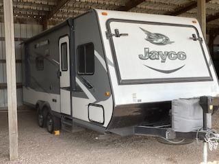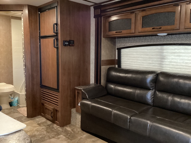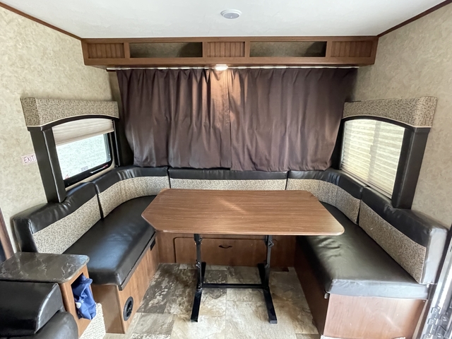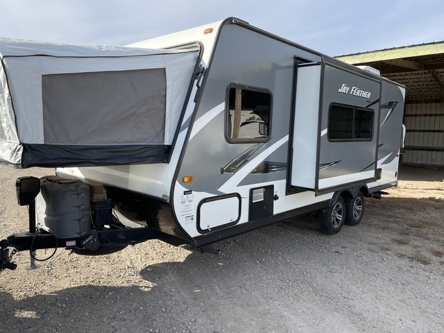 If you’ve ever dreamed of hitting the road with BIG features in a LIGHT package, this is the one. The X23B Jay Feather expandable (hybrid) by Jayco features a u-shaped dinette, single slide, plus front and rear beds. As you enter to the right is a u-shaped dinette with overhead cabinets. A sofa slide provides additional floor space in the living/kitchen area. A refrigerator is next to the sofa and across from the kitchen amenities.