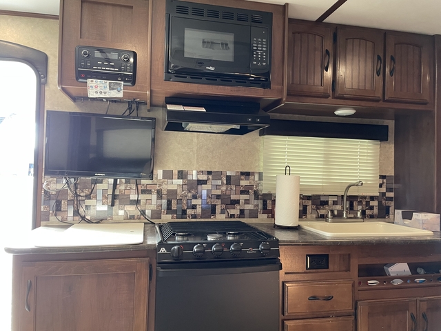 The other side features a pantry, kitchen sink, three burner range, microwave, overhead cabinets, and a TV.
