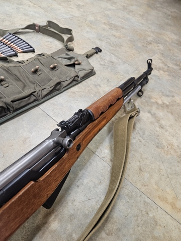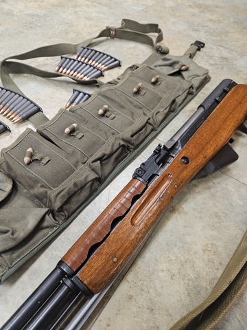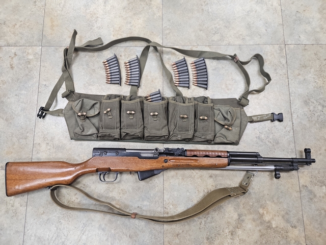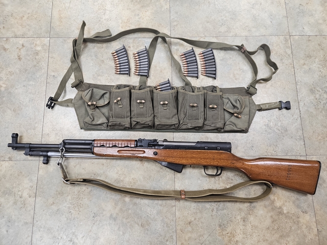 Extras include: sling, type 63 chinese sks chest rig, 30 round fixed magazine ( not pictured), 5-10 round stripper clips with 100 rounds of ammo.