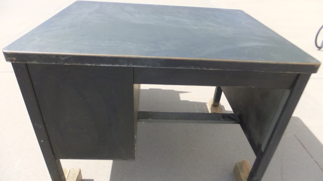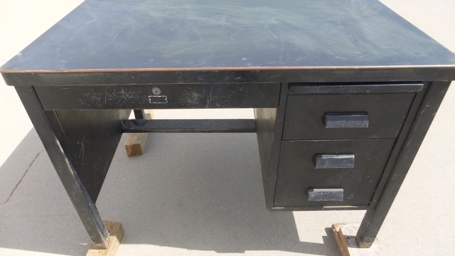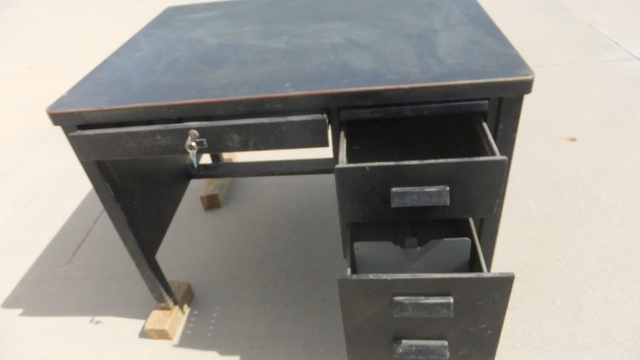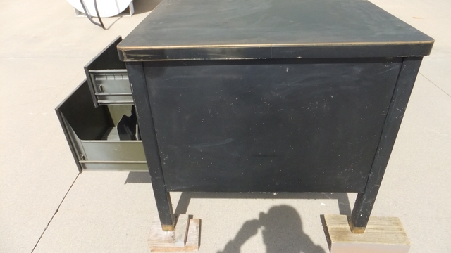 Used desk with some scratches and some color fading. 45" wide 34" deep, and 30 1/2" high. Fully lockable, with keys. Pull out right hand writing tray, pull out single file drawer, and a pull out double file drawer. Very Heavy Duty Construction. Pickup ouly, no shipping.