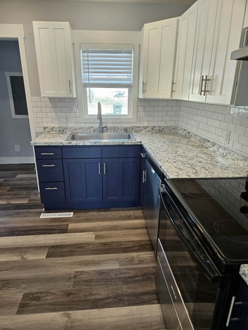 Completely renovated with gorgeous vinyl wood flooring throughout. Beautiful countertops and fresh modern cabinets add to the beauty of the sunny kitchen. Stove/oven combination, full size refrigerator, and classy faucet and hardware complete the modern look and feel.