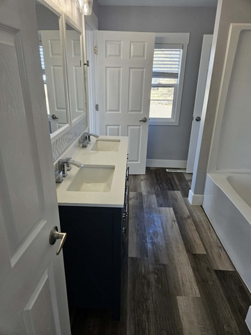 The updated modern bathroom has double sinks with lovely lighting above. The tub and shower combo are perfect for everyone.