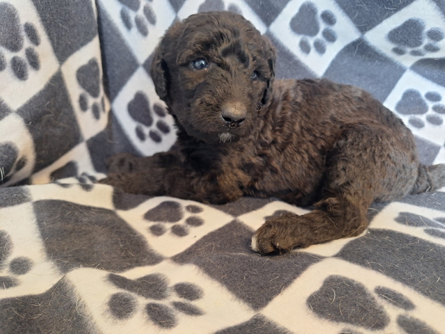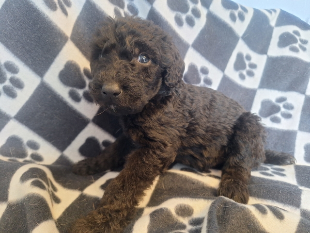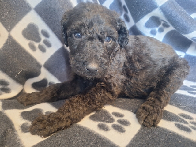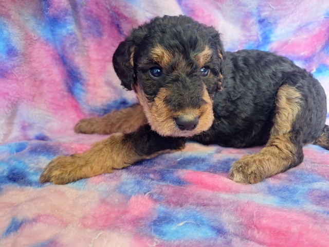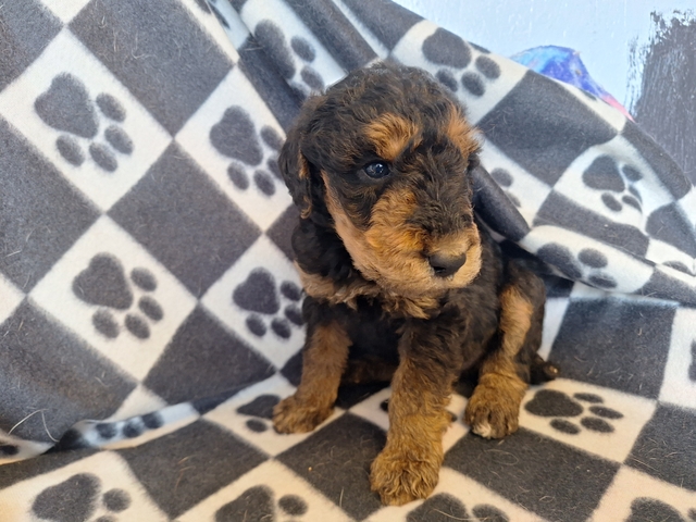 Airedale x Standard Poodle. Ready end of April. Will have 2 sets of shots, dewormed, vet checked and year genetic health guarantee. Males and females. $600 each. No holds without deposit. 620-792-5910
