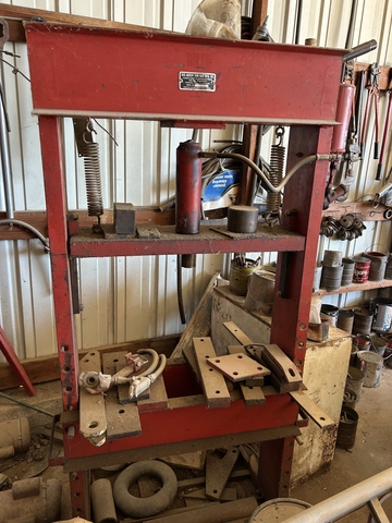Shop Equipment: PTO Powered Onan Generator w/ Lincoln AC DC Buzz Box Welder on a 2 Wheeled Trailer - Oxy Acetylene Unit on Cart – Red Arrow Tow Bar MFG CO Press SN U22349L – Olson MFG Band Saw Model Number 0-100 SN 6516 – Shop Built Cherry Picker - Small Anvil – Parts Organizers – Ladders – Shop Vac – Barrel Pumps – Oil Pumps - Shovels –2 Wheeled Dolly - Oil & Air Filters – Old Starters & Alternators and More –Old Hand Pump - ATV Sprayer & Booms – Old Steel Rims – Fuel Tank w/ Hand Pump – 9.00-20 Tires & Steel Rims – Wheel Barrel – Post Hole Diggers – Scrap Iron – Irrigation Pipe – Misc. Livestock Panels
