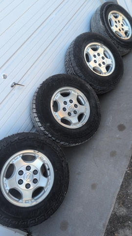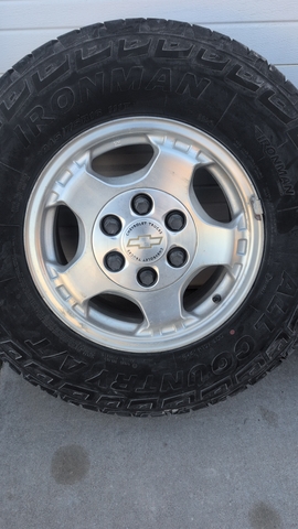 2002 Chevy half ton 16 in aluminum wheels and caps, Three have decent Hercules tires on them, The other tire is no good
