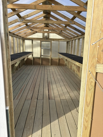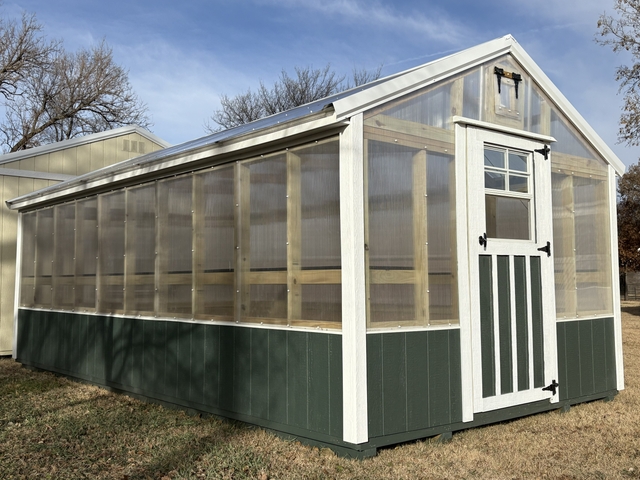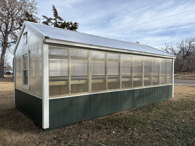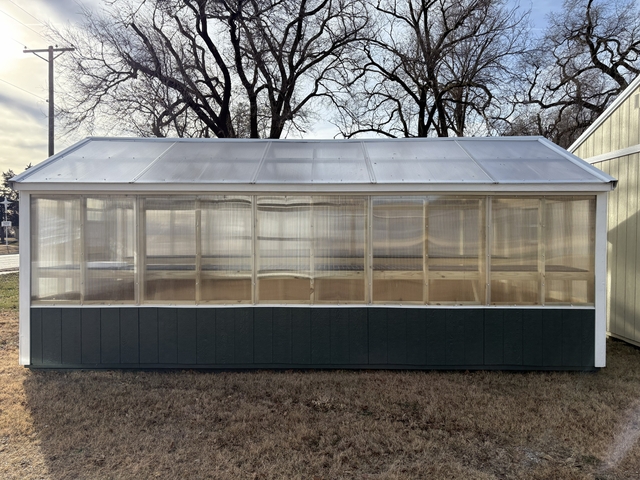 This spacious 10 X 20 x 6 Greenhouse Made by Mid America Structures is here and ready to meet your Spring planting needs. Features include: 8mm Double Wall Polycarbonate sidewall and roof to reduce condensation, 22” Poly Shelves, (2) 10” Auto Adjusting Gable Vents, 2 x 3 Single Pane Window and 36” Door with 2 x 3 Window, LP Emerald Green Siding & White Trim. Constructed using pressure treated lumber.