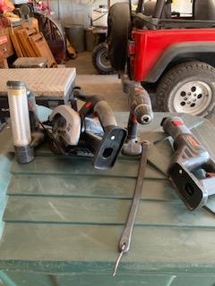 Drill, work light, circular saw, reciprocating saw, charger and case. Batteries are dead. Everything was working fine when last used.