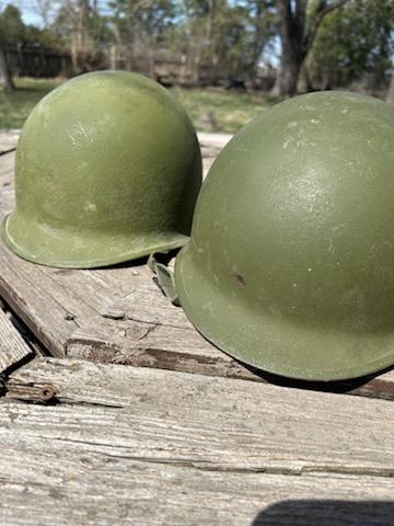 Two WWII era M1 helmets. One with a liner. $100.00 for the one without the liner ans $150.00 for the one with the liner.