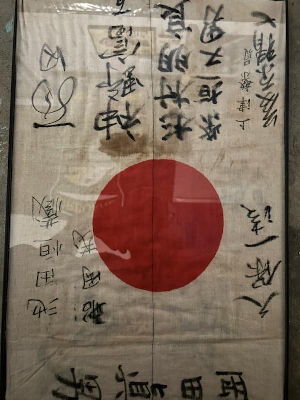 WWII Japanese "Good Luck" flag. It was framed with I purchased it. Has some kind of stain on it which could be blood or something else. Has Kanji (Japanese writing) on it. Measures about 12 inches by 18 inches ish. I didn't measure it so that's just eye balling it. I've been collecting for years and don't remember much else about it unfortunately.