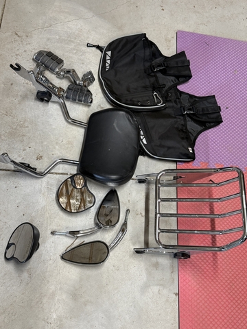 Extra foot pegs, mirrors, a backrest, and a wire book rack.