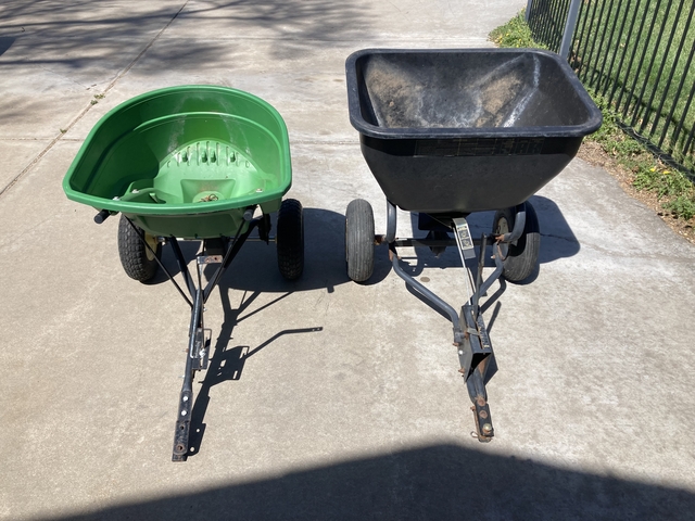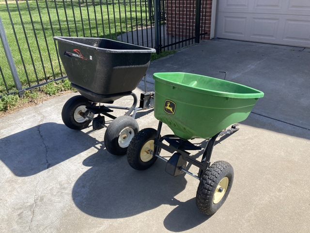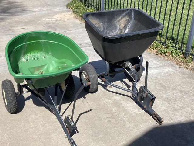 Two lawn seed / fertilizer broadcast spreaders for sale. One is a John Deere brand that has a bit of an axle or gearbox issue (120lbs. capacity ??) . The other is a Brinley (140lbs. capacity ??), - works as it should.
