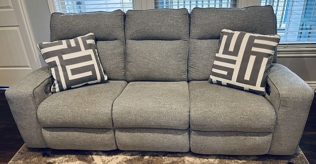 Light gray (pewter) performance fabric by nuvella. Only 9 months old like new condition in a non-smoking household. Throw pillows included.