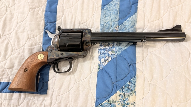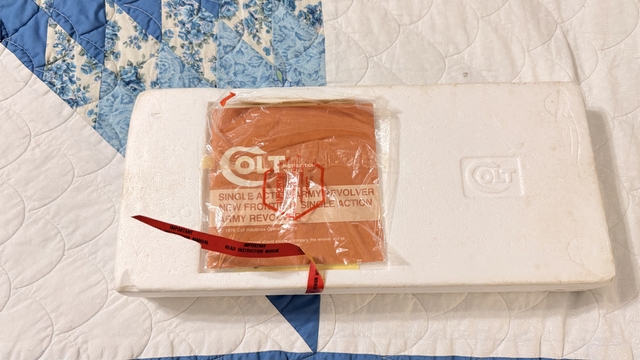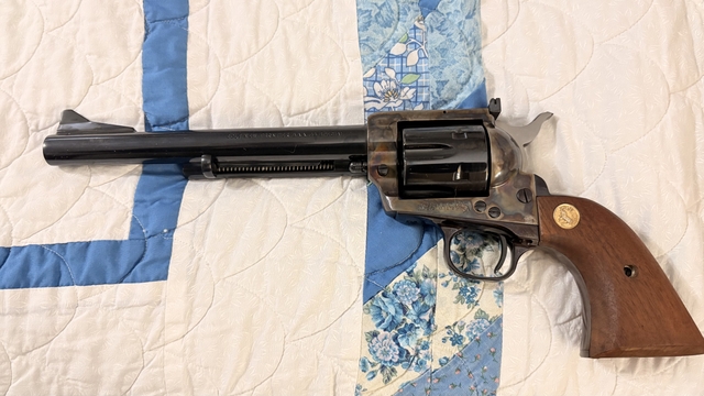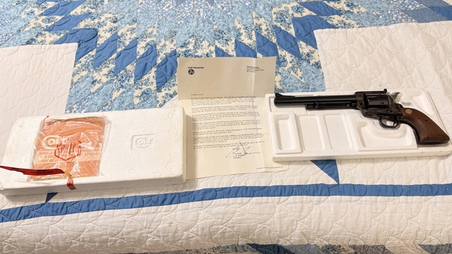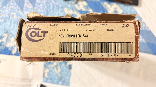 Up for sale is a new 1979 Colt SAA New Frontier revolver with 7.5 inch barrel chambered in .44 Special up for sell. This one is New with the original box and manual and Colt letter. No turn line. The box is in 90-95% condition. The original smooth walnut grips, numbered to this gun, are included. This revolver was made in 1979 according to the Colt and the serial numbers.