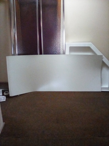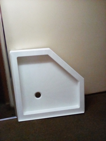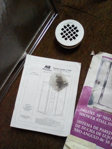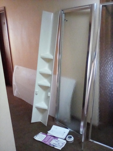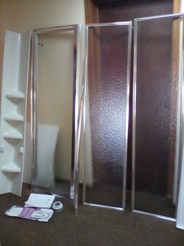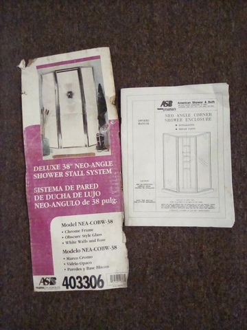 38" Neo Angle Shower Stall Kit, heavy gauge aluminum frame, thick tempered safety glass, 3 piece high glass walls and shower base, corner daddy with three large shelves and a foot rest L 38" x W 38" x H 75.625." This item was bought new and never used, which cost over $500. and being sold for just $160. Call for further information at 785-443-8574 NO TEXT PLEASE WILL NOT RESPOND.
