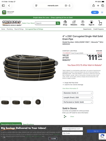4" Solid Drain Pipe. Bought at Menards, changed my mind and used solid pvc pipe instead.