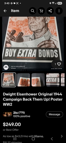WWII Eisenhower War Pond poster for sale. I obtained this from a family member who had cleared out his estate upon death. He worked at the Wichita Boeing Plant helping build B-29s for the War. These posters would hang up around the Plant and would be swapped out with new ones every so often. I was told when new posters were going up he would take a few old ones with him to keep and this is one of them. (Bottom of poster had small area of damage from when it was removed from the wall at the Plant). Comes with a frame. I posted a screenshot of another poster someone has listed as reference.
