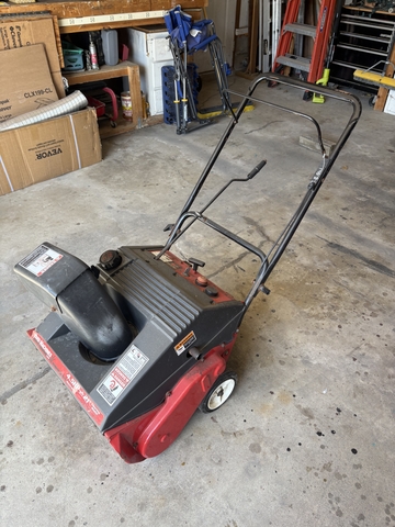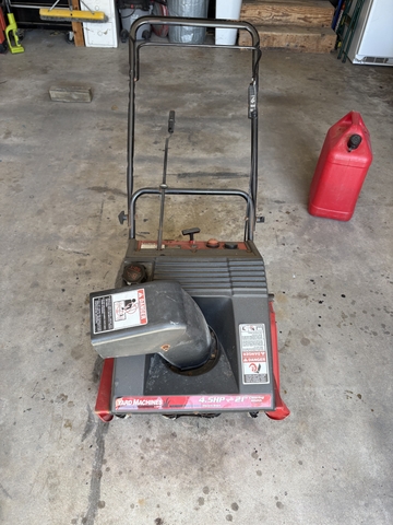 Yard Machines 21" snow blower. Starts right up but needs carburetor work.