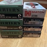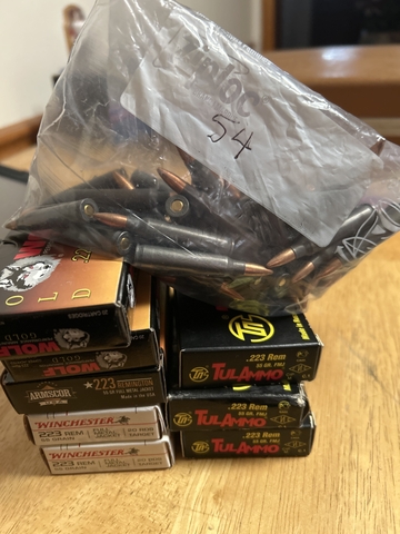 For sale 223 rem ammo FMJ three boxes on right and bag on top steel case the five boxes on right are brass cased $90.00 for all.