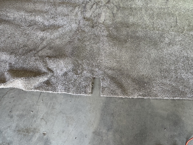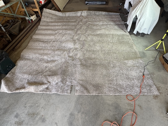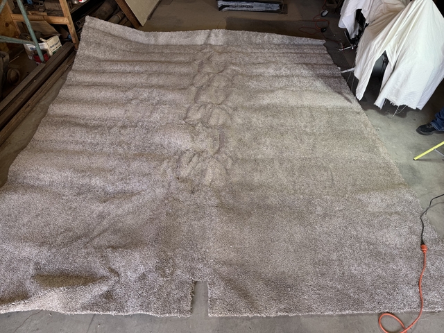 This measures across 123" x 143" excluding the 8" cut out. No pad included. This is very soft with warm taupe and gray shades. Been rolled without a tube inside and then folded for storage explains the strange creases in it. There are no stains or smells. No longer need.