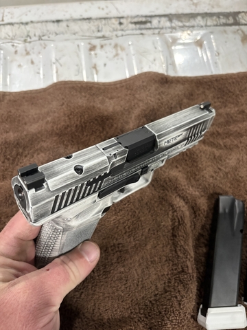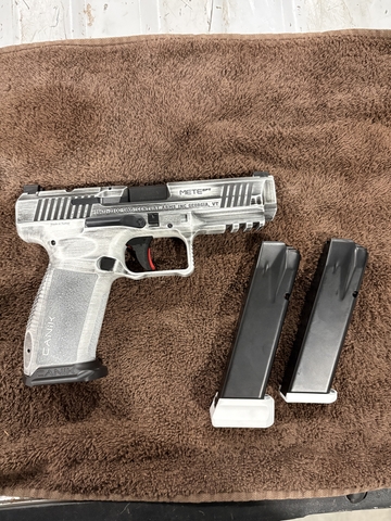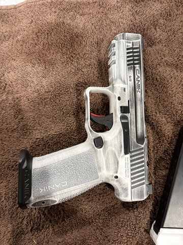 Canik mete sft in distressed white will come with the original case holster and 2 mags one being extended both matching does have a picatinny rail on bottom and is optics ready has the charged ready sight on rear of slide and a nice factory trigger has had shells in the magazines but has never been fired message me on here or text me make an offer worst I can say is no thanks 620-204-0454