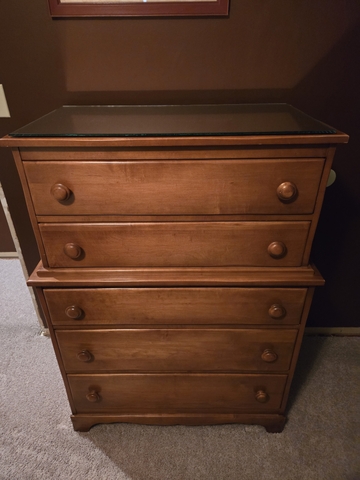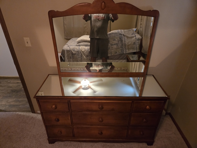 Comes with mirrored dresser, chest of drawers, headboard/footboard, and nightstand. All come with custom cut mirrors for the tops.