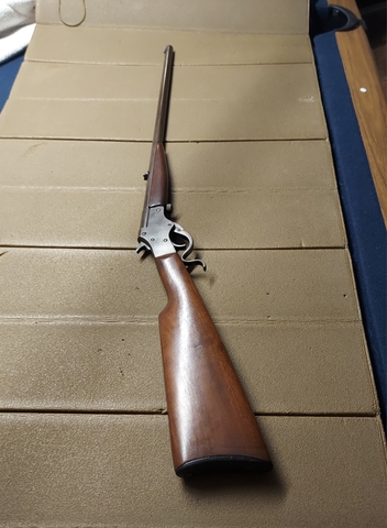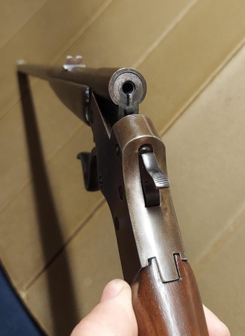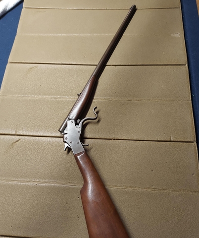 This is a tip up lever action breach, single shot .22. It's in great shooting condition and is surprisingly accurate. I believe it was procured sometime between 1911 and 1930. It also can be broken down in half with one bolt. Nothing wrong with it, it has some wear for its age but you can still faintly see the model "marksman" on the receiver. Open to trades.