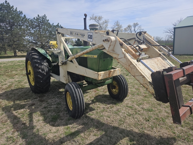 Good running 1964 JD 4020 diesel powershift Sandard Tractor. Less than 3100 hours. Strong engine and strong powershift. PTO but no 3 point. GB900 loader. Have had cylinders rebuilt. Nice 8' bucket. Tractor and loader work just like they should. Will seperate. $13,750.00 for both. Salina, Ks