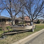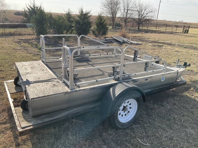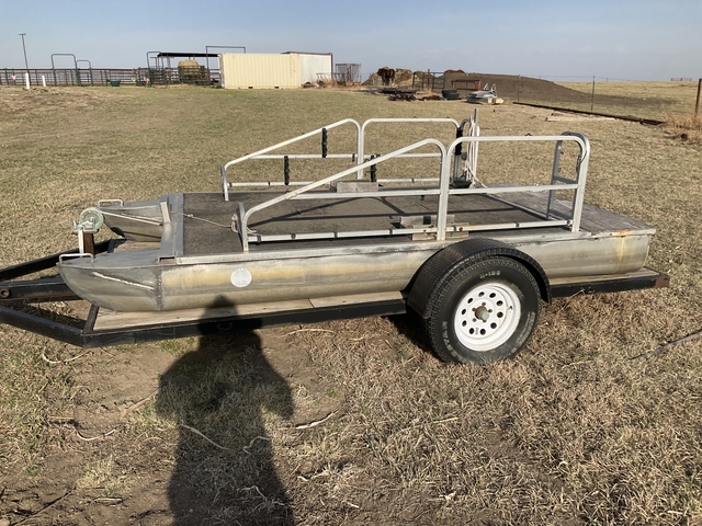 12 pontoon. Deck is 6' wide and 8' long. Chairs swivel on pedestal (2) come with. They were kept indoor.