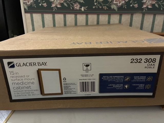 Brand New. Glacier Bay Oak Medicine Cabinet. 15" Recessed or Surface Mount,