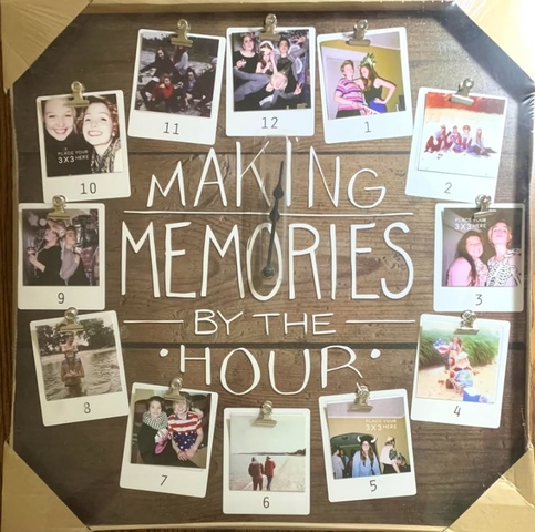 Brand New…"The Making Memories By The Hour" photo clock is a great way to display your favorite photos of family and friends. This functional clock features 12 spaces with clips, which makes it easy to switch out and to display 3 in. sq. Photos, Keepsakes, Mementos, and etc. The large oversize face makes it so easy to read the time. Requires one "AA" battery. Clock measures 20 in. sq. Made of MDF and metal. Clock is ready to hang. Clock is in original packaging. $20.00 Would make a great gift too.