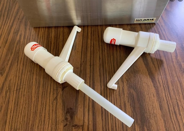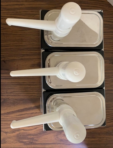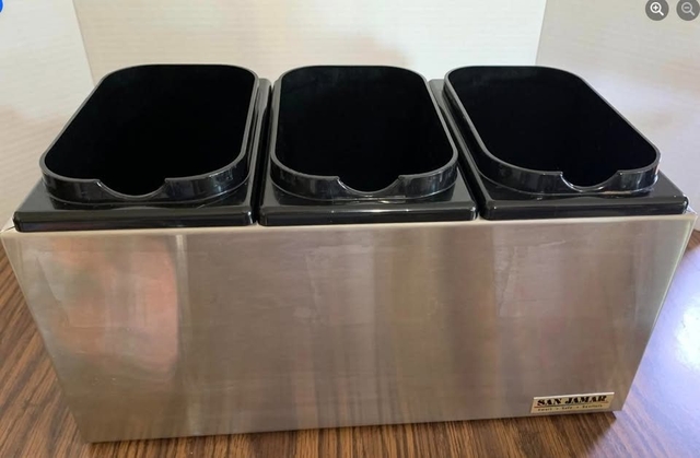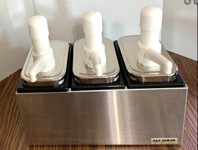 San Jamar Three (3) Compartment Condiment Pump Service Center. Clean and in used GREAT condition. San Jamar Three (3) Compartment Condiment Pump Service Center, which is perfect for dispensing condiments, dressings, and sauces. Centers are great for self/service areas and back of the house applications where portion control is critical. Ultra pumps dispense 1 ounce portions per stroke. Each 2 1/2 quart black jars are removable for easy cleaning, and refilling, and offer an upscale look to the attractive, stainless. And because of its stainless-steel construction, this item is guaranteed to have a long life at your concession stand, food, truck, fast food, restaurant, or busy food service areas. The dimensions are: