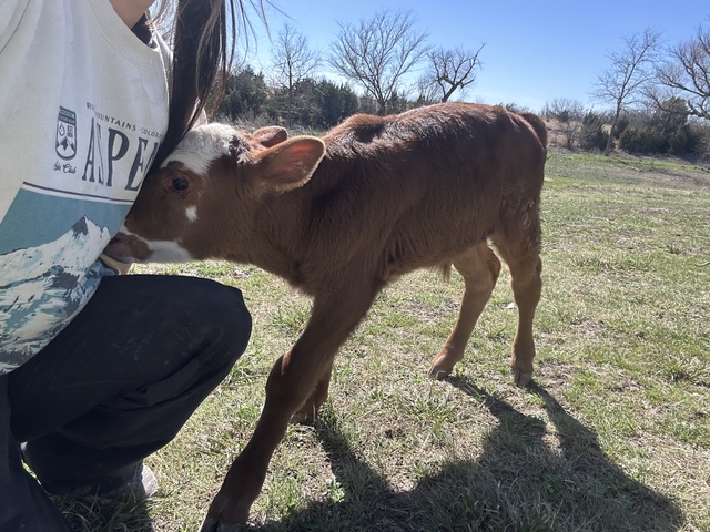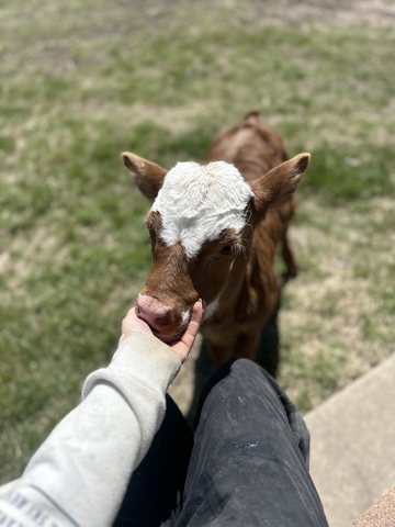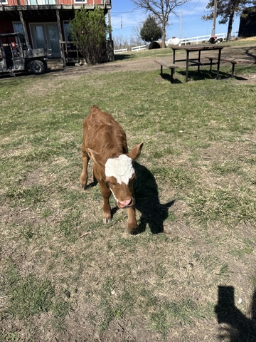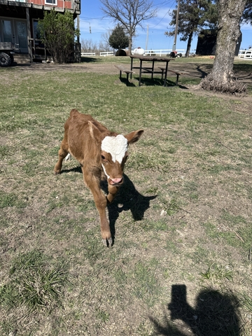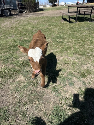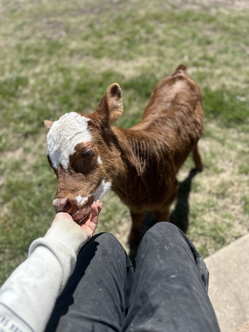 I have this bull calf up for grabs! He was born on March 17th 2026 at 7pm. Out of my mini jersey cross cow (her second calf) and sired by my registered Hereford bull. Weighing 60 pounds and full of energy! He eats 3/4 of a bottle of raw milk in the morning and 3/4 of a bottle in the evening. At birth he was given his mom’s colostrum (1.25 gallons in the first 12 hours) and also received a syringe of trishield first defense paste. He’s a front yard calf and loves to hangout on the porch. Will take any opportunity to get in the house! Going to make a nice future steer and fill your freezer! Will come with two free gallons of milk. Located in Lindsborg Kansas. Call or text Emma at 785 294-1702