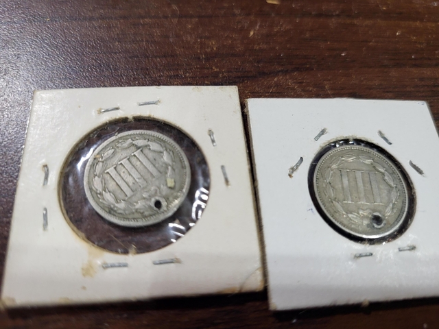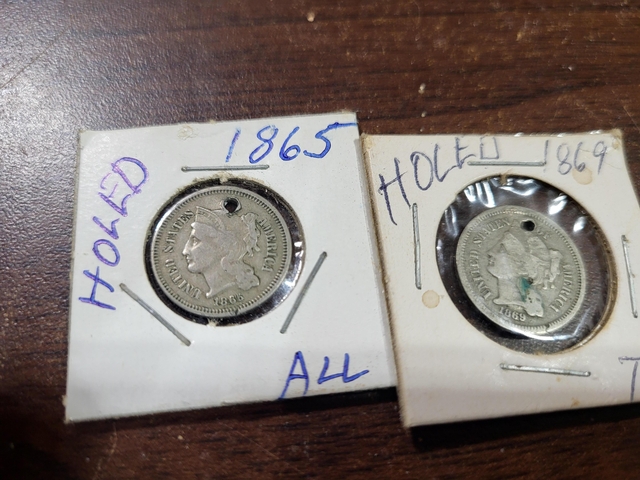 1865 and 1869 three cent nickles, nice condition with the exception of being holed, $15 each