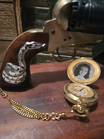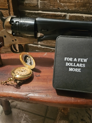 Replica pocket watch with case from the movie "For a Few Dollars More" and it also plays the chime. Works great!